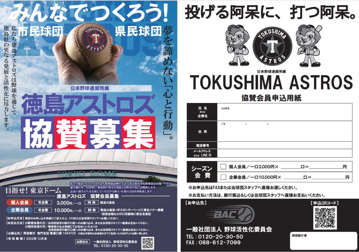 徳島アストロズ協賛会員募集